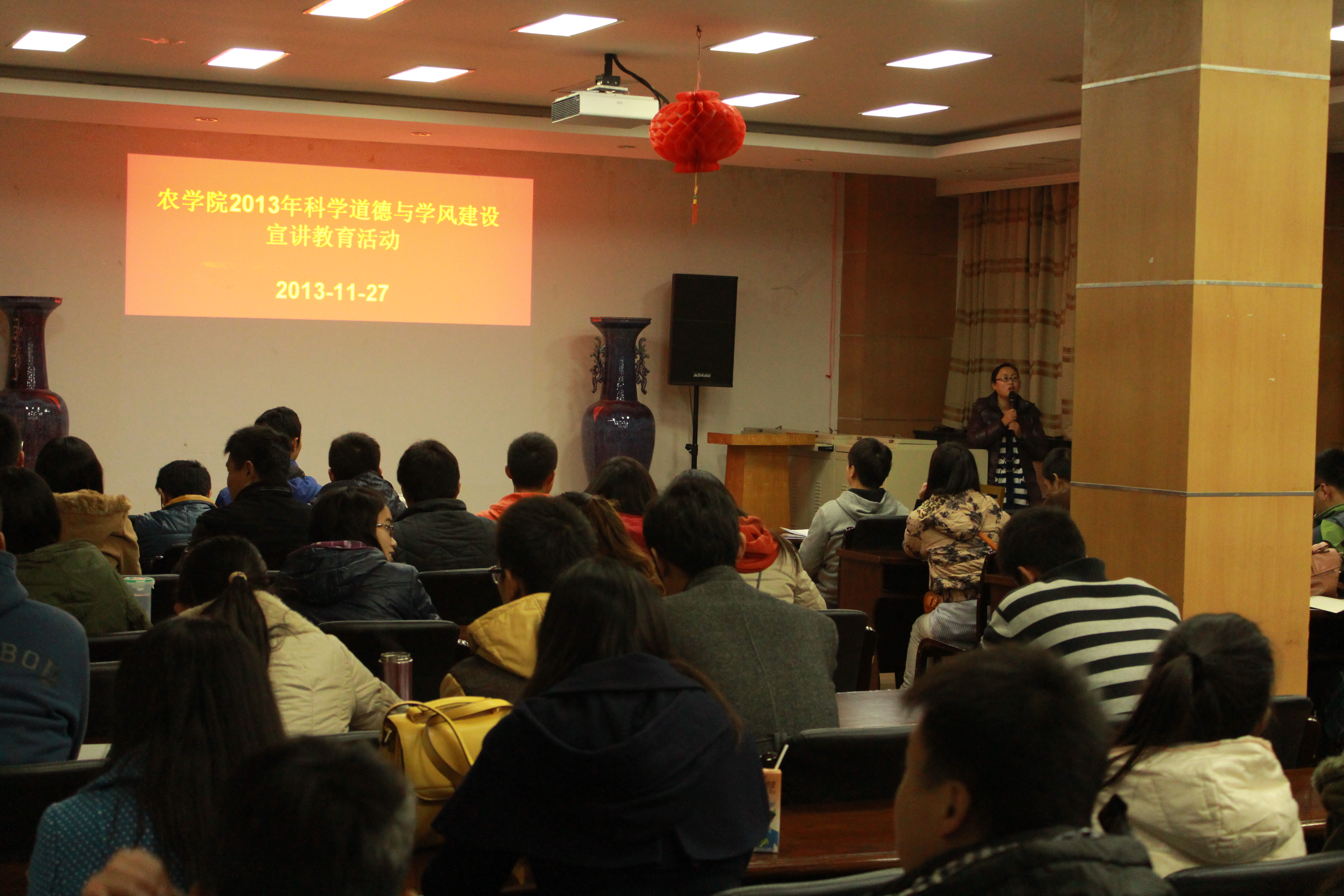 院士、南京大学教授吴培亨在《铁肩担道义妙手著文章》的主题报告中勉励广大研究生在科学研究中一丝不苟、严谨学风、坚守学术诚信,自觉将自己的一言一行与国家的命运、兴衰荣辱联系起来,在道德修养、专业技能上不断进取,为我们国家更美好的明天作出自己的贡献。镇江市农科所研究员赵亚夫在题为《老实做人认真做事》的报告中现身说法,勉励同学们树立正确的人生观、价值观,学会思索人生的价值和意义,鼓励大家学一行、爱一行并且干好一行,老实做人、认真做事。