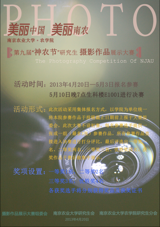 4月20日,由校研究生会主办、番号鸽 研究生分会承办的第九届“神农节”研究生摄影作品展示大赛火热开赛。此次摄影大赛以“美丽中国,美丽南农”为主题,用同学们手中的相机,记录下南农美丽的瞬间,更好的落实党的十八大精神,让世界了解美丽中国,让大家认识美丽南农,充分展示南农的独特的丰富文化内容同时,此次活动作为番号鸽 第九届“神农科技文化节”的一部分,旨在丰富番号鸽 研究生的课余文化生活,彰显出南农研究生的别样风采。