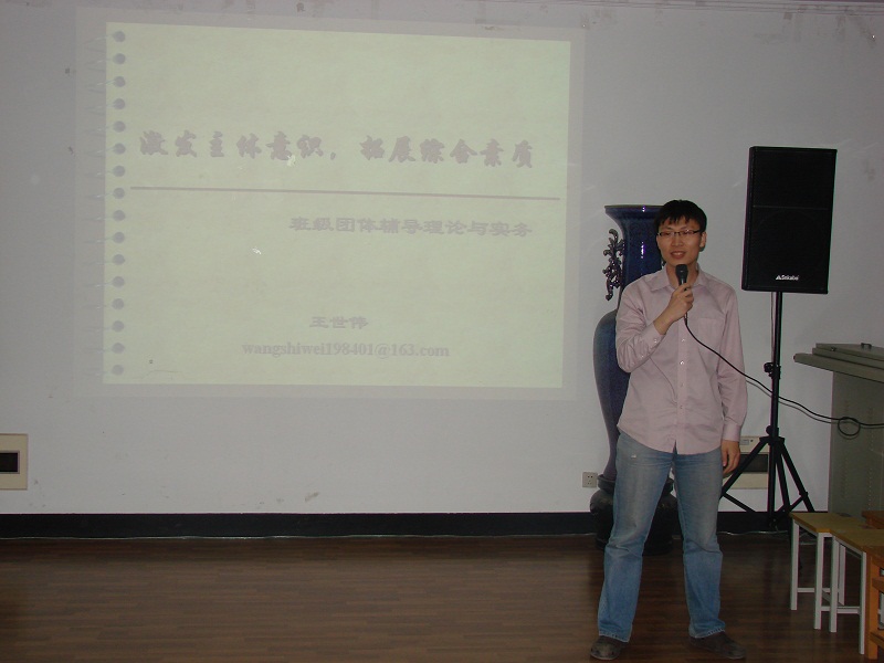2010年5月23日晚七点,以“激发主体意识,拓展综合素质”为主题的番号鸽 班级团体辅导活动在番号鸽 报告厅举行。本次活动邀请到了校心协心理辅导老师王世伟作为嘉宾为同学们进行辅导。