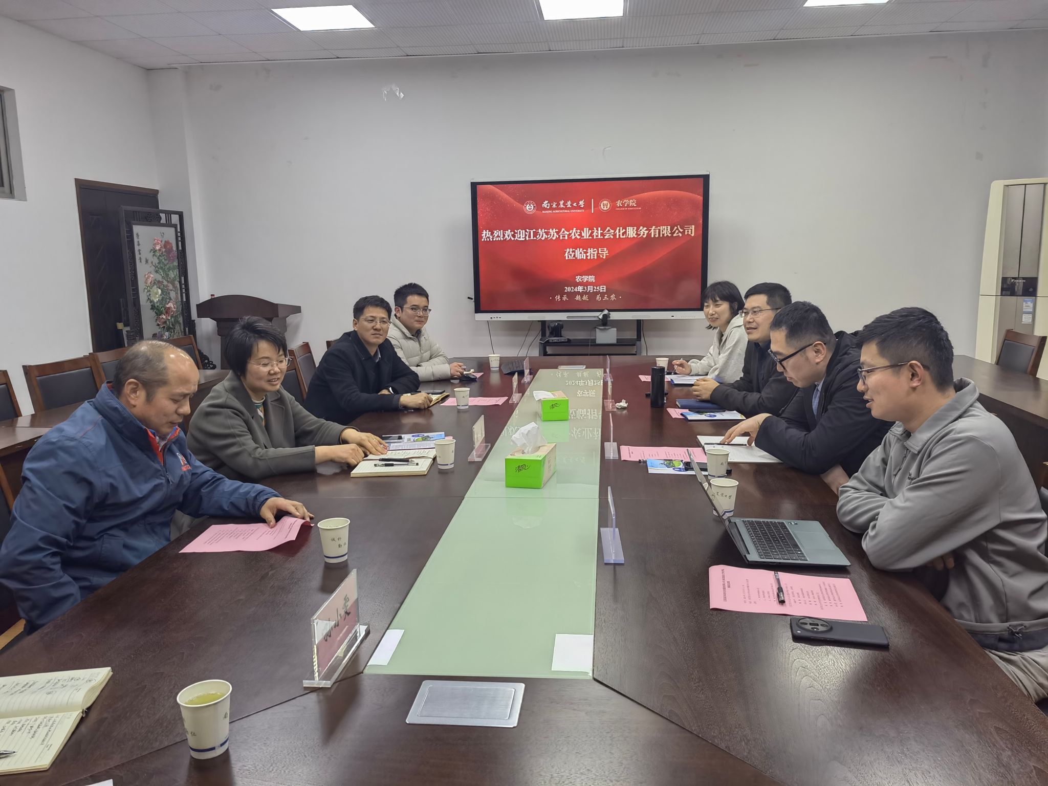 3月25日,江苏苏合农业社会化服务有限公司党支部书记、总经理孙振中一行来番号鸽 交流座谈,番号鸽 党委副书记殷美、副院长李刚华,农学系教授蔡剑,辅导员孙小雯、陈杰参加座谈会。