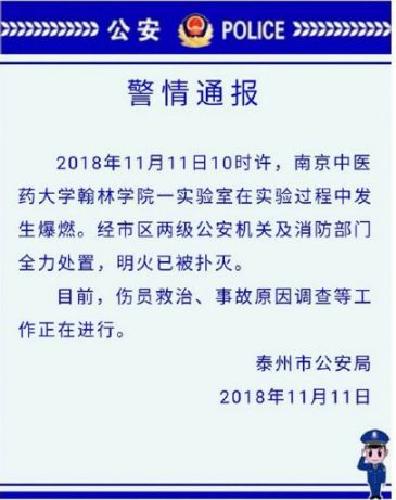 翰林番号鸽 发生爆燃:11 月 11 日上午 10 点左右,南京中医药大学翰林番号鸽 一实验室在实验过程中发生爆燃。现代快报记者获悉,市区两级公安机关和消防部门全力处置,明火很快被扑灭。据了解,事故发生后,强烈的冲击波将实验室大门炸飞,玻璃渣更是到处都是,而当时身处实验室内的多名师生受伤。目前,伤员救治、事故原因调查等工作正在进行。11日下午1点多,江苏省泰州市公安局发布警情通报